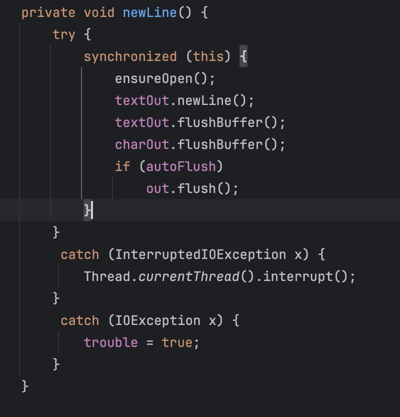 멀티 스레드 환경에서 첫번째 스레드가 newLine() 메소드를 실행하면 다른 스레드가 접근을 할 수 없다. 다른 스레드는 첫번째 스레드가 모두 사용하고 잠금을 풀어준 뒤에서야 newLine() 메소드를 실행할 수 있다.