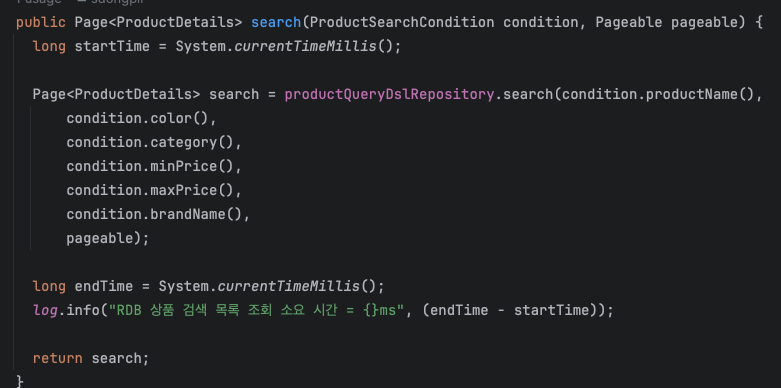 상품데이터는 100만건, 상품 검색 조회 시 JPA QueryDsl을 사용하여 검색 조회를 하였고 소요시간은 꽤나 걸렸다.